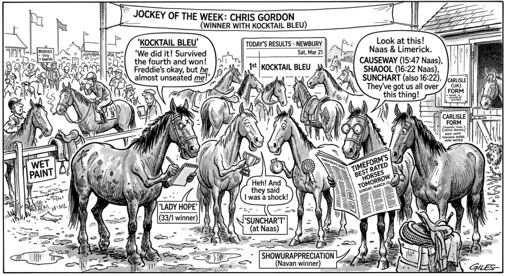 Strategic communicator of racing nonsense. From Cheltenham to Ascot, I serve up cartoons, memes, and commentary for punters who know the pain of ‘going well until two out.’