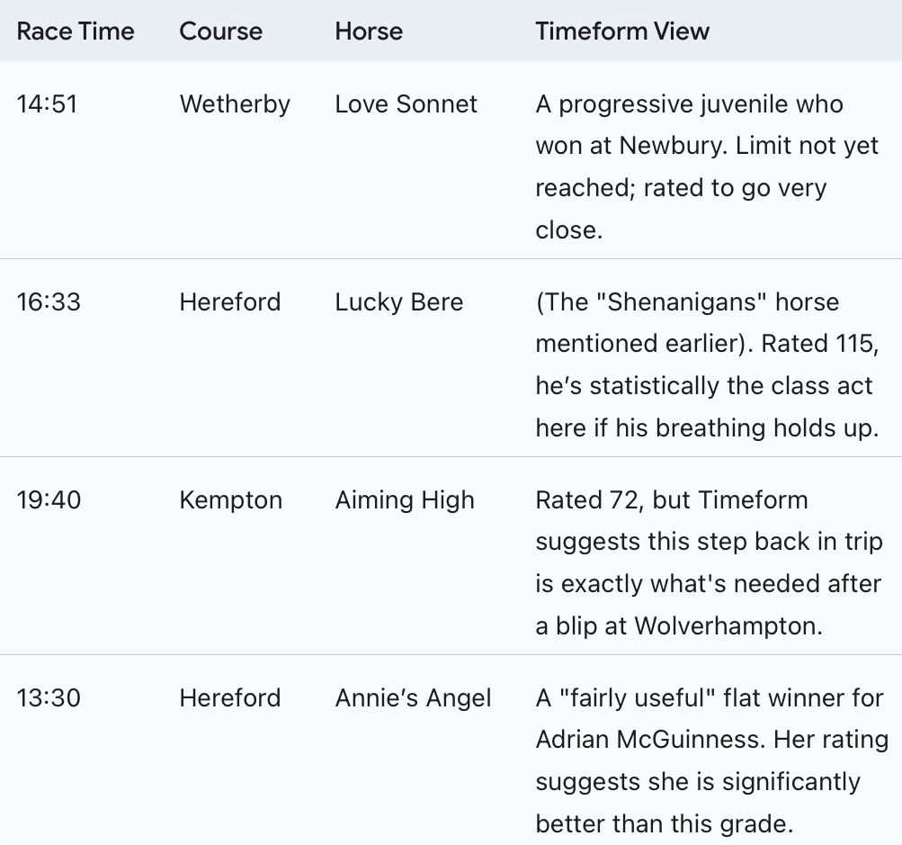 • Verdict: Currently the standout bet at around 15/8. He was a comfortable winner at Wolverhampton recently and remains well-treated despite a 3 lb rise, he has “more in hand than the margin suggests.”