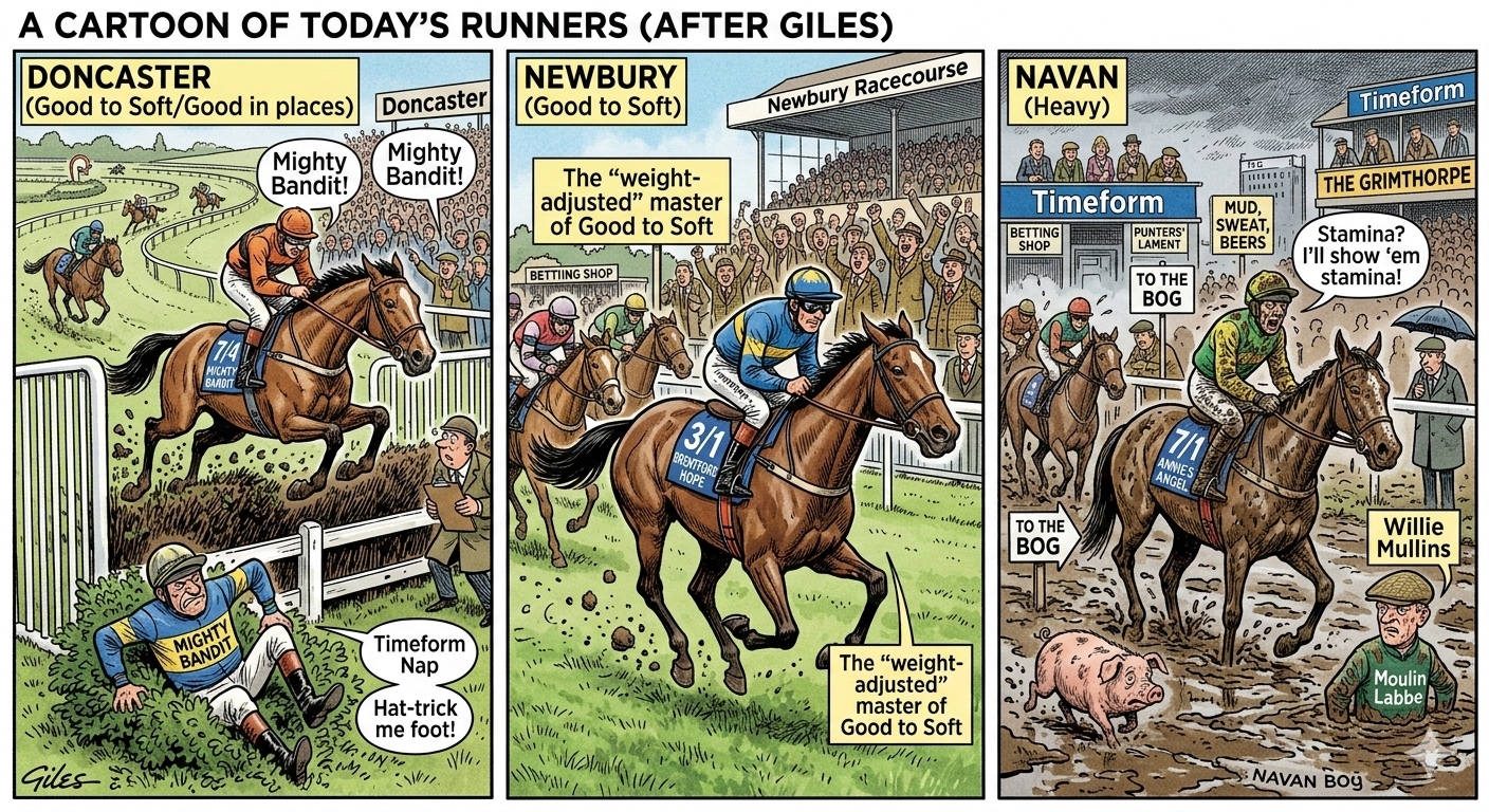 It’s a Saturday of mud, sweat, and perhaps a few beers as we look at a packed card across Newbury, Doncaster, and Navan. Whether you’re hunting for a “sure thing” or just looking for a reason to shout at the TV, here is your witty rundown of today’s top-rated contenders.