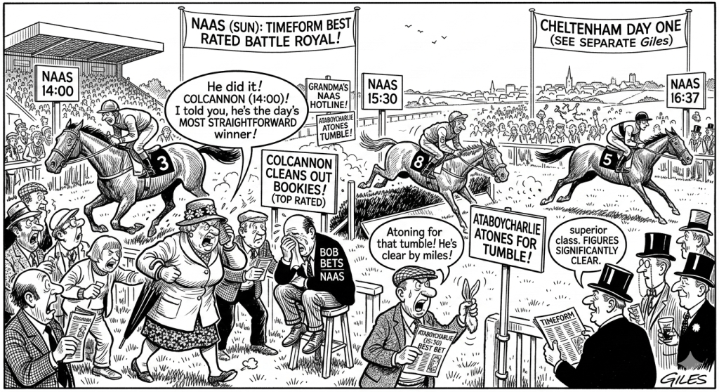 • 14:00 Maiden Hurdle: Colcannon is the one they all have to beat. Timeform has him as the clear standard-setter in a race where most of the field are still learning which way is up.