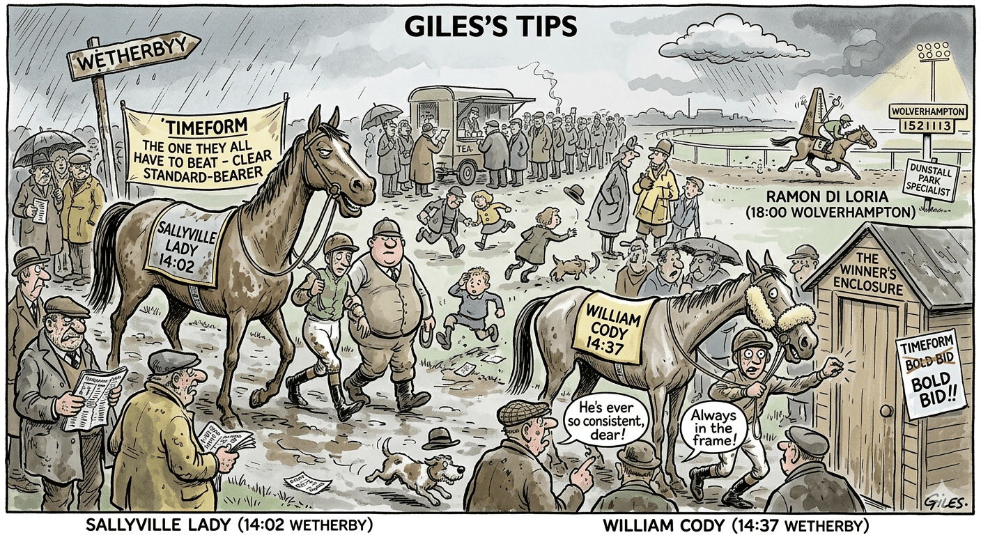 • William Cody (14:37 Wetherby): A model of consistency (if not winning). He’s hit the frame in his last four starts and gets the “cheekpieces” boost tomorrow. Timeform has him marked for a bold bid.