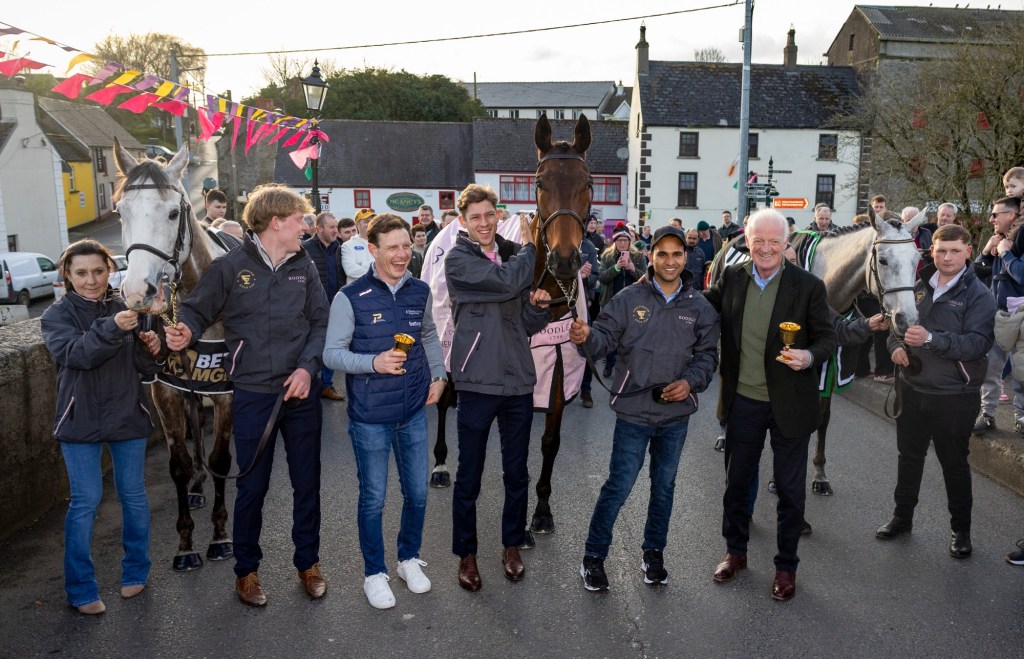 The village of Leighlinbridge is likely still vibrating after Wednesday evening’s homecoming. Willie Mullins,who left Cheltenham with 8 winners and his 13th Leading Trainer title,paraded his “Green Team” through the streets.