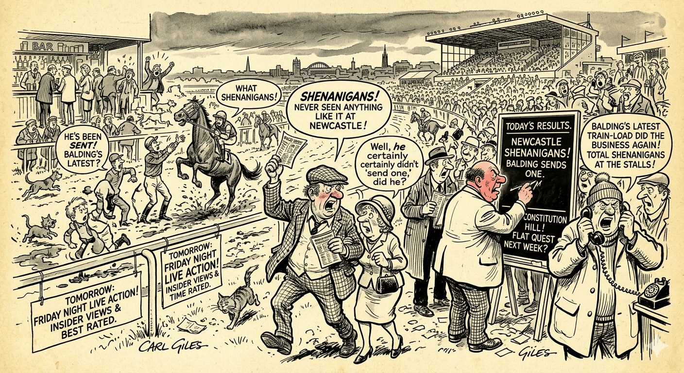Newcastle’s Tapeta surface lived up to its reputation for drama today. The “shenanigans” started early when Tiger’s Nest was withdrawn after getting upset in the stalls, causing a 15p Rule 4 deduction that left many punters frustrated.