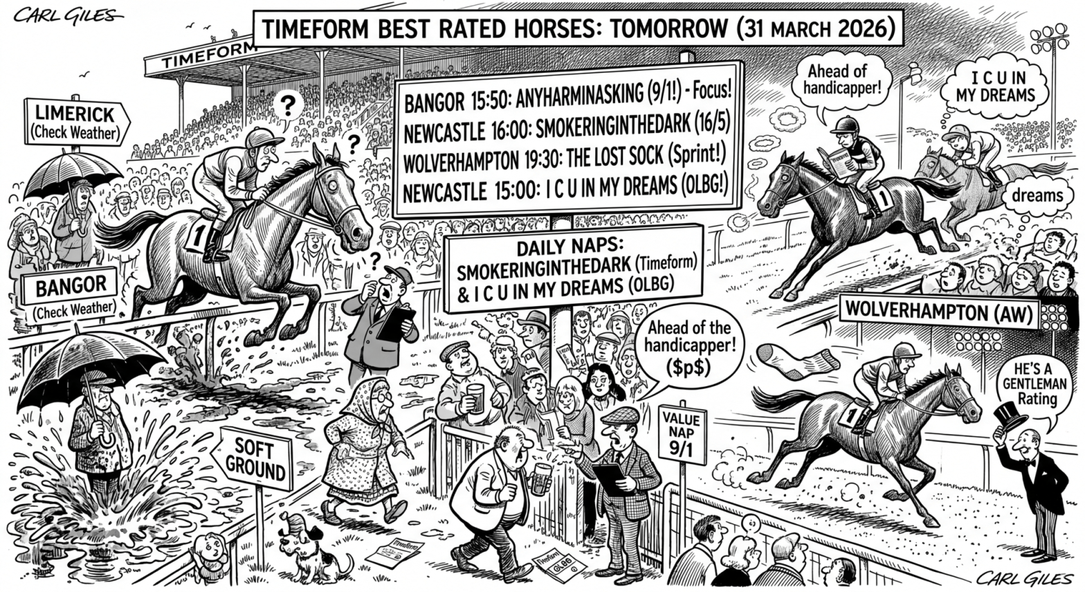 Bangor-on-Dee (Jump): Starting at 14:15. Expect “Good to Soft” conditions. A track for nimble jumpers who can handle the tight turns.