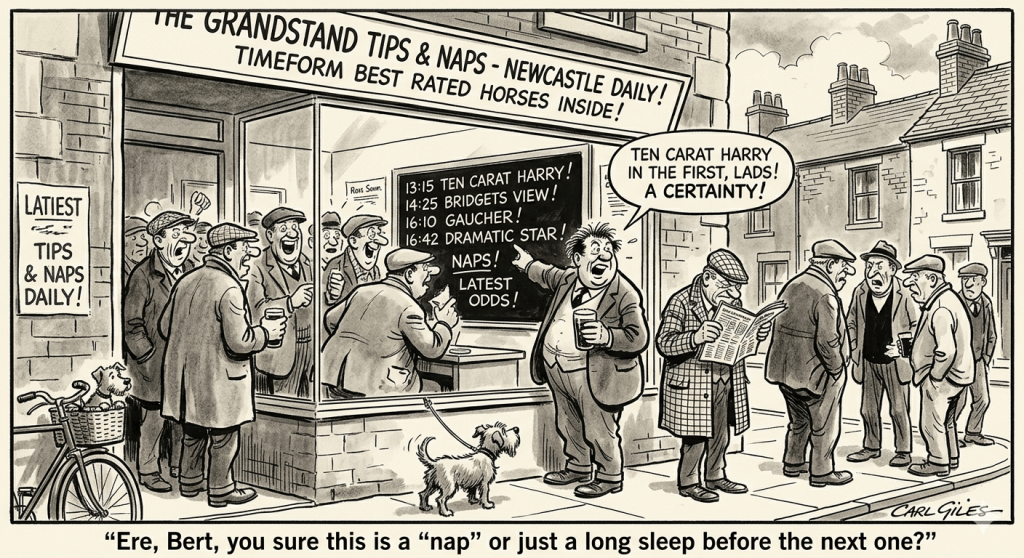 It’s the £1 million prize fund day. Expect a stiff finish on the North East’s tapeta that makes grown sprinters cry.